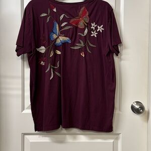 Johnny Was Burgundy Short Sleeve Tee with Floral and Butterfly Design