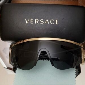 Authentic Versace Tribute shield sunglasses featuring the iconic Medusa medallion. This bold wraparound style is a signature Versace design and highly sought after by collectors and statement-fashion buyers.