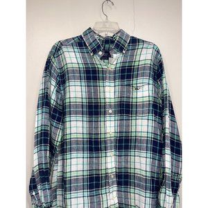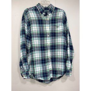 Vineyard Vines Mens Shirt Plaid Linen Slim Fit Trucker Shirt Medium Blue Green Whale