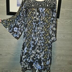 Free People Black Blue Floral Crochet Top Bell Sleeve Mini Dress Boho Size L