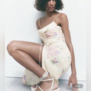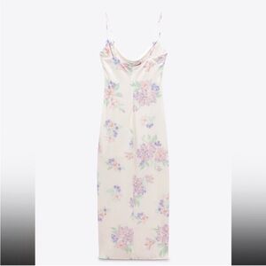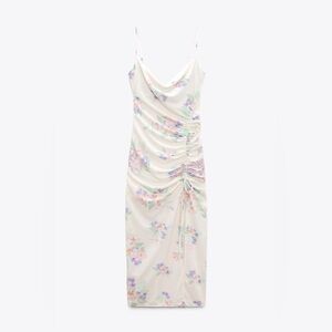 Zara Floral Print Cowl Draped Neck Ruched Adjustable Front Slit Midi Dress