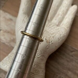 This elegant vintage 1977 Avon Frostlights Art Deco Revival ring featuring a pink camphor glass centerpiece with a starburst design and a central rhinestone accent for adding a touch of sophistication to any outfit. I believe the gold things inside of the band is a sizing bar. The ring is pushed pretty tight onto my metal bar and it says size 5
