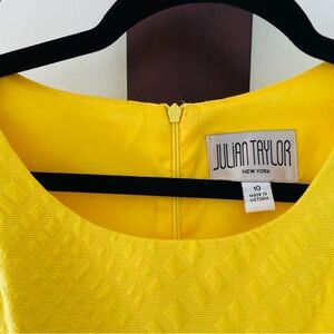 Vintage yellow midi dress by Julian Taylor. Features textured fabric and a stylish belt with buckle. Ideal for any event. Marked a size 10, but fits more like an eight. It so too small for me.Amazing condition could be mistaken for brand new! great for the spring..