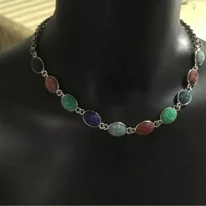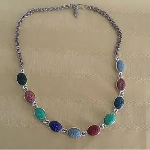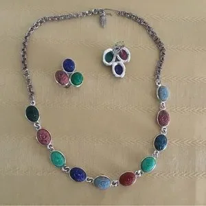 VINTAGE SILVER SCARABS NECKLACE 18” & CLIP EARRINGS