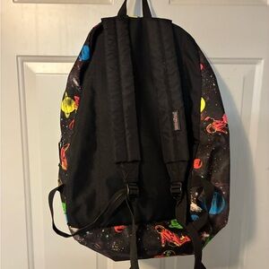 Jansport backpack with colorful planets and astronauts. Black background with vibrant space design.