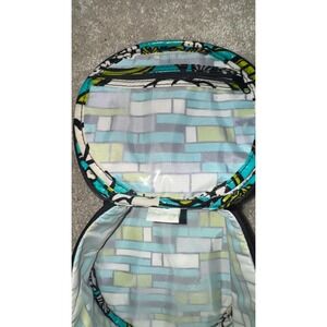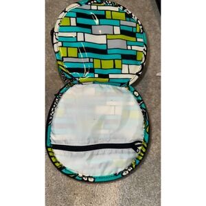 Round Vera Bradley makeup box. Island Blooms pattern. The exterior features a lively mix of green, teal, and white floral designs. It has a convenient carry handle and a zippered closure. The interior is lined with a complementary geometric pattern and includes a zippered compartment for organizing your essentials. See photos for stains. Retired pattern.