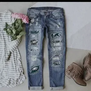 Stylish blue distressed jeans featuring unique Philadelphia Eagles patches.