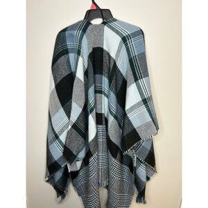 Details: blue plaid, ultra soft, cozy poncho style shawl, on small stitch tear at collar, does not affect wear or use or look, check pictures for measurements,