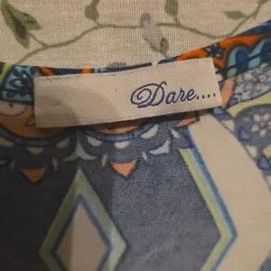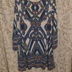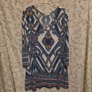 A long sleeved tunic featuring a vibrant geometric pattern in blue, orange, green, and white. Can be worn as a dress or with leggings. Perfect for any occasion. Size XL