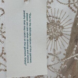 Simply stunning, our maxi-length, mesh dress, with empire waist, ruffle hem and sleeves, allover embroidery, lace inserts, side zipper and keyhole button back. Separate slip. Polyester. Hand wash