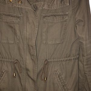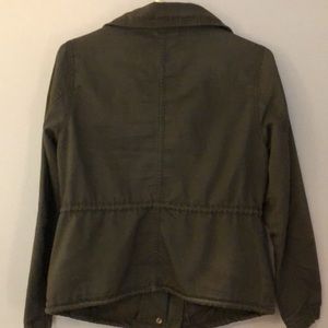 OLD NAVY army green jacket. 100% cotton. Two hand pockets. Two chest pockets. Cinch string around middle. Draw strings at waist. Both zippers and snaps are covered. Excellent condition. Size XS.