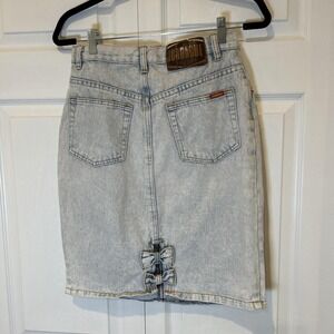 Iconic vintage Jordache acid wash denim skirt with a classic high-waist pencil silhouette. Features a structured fit, five-pocket styling, zip fly with button closure, and a standout back slit with decorative denim bow details for subtle statement appeal. Timeless Y2K-meets-90s denim that works effortlessly with cropped knits, baby tees, or oversized sweaters.