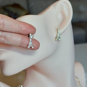 Elegant gold earrings shaped like the Eiffel Tower. Embellished with sparkling stones.