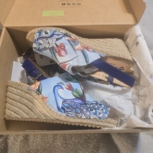 Step out in style with Anuschka's floral wedge sandals. Featuring a vibrant blue and tan design, peacocks and these shoes offer both comfort and elegance. Perfect for any occasion.