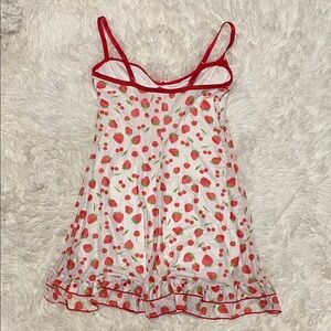 Charming strawberry print chemise. Features red trim and bow accents. Perfect for a playful look.