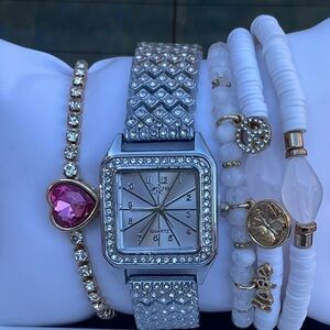 Enhance your style with this elegant women's watch set featuring a dazzling silver watch adorned with sparkling stones. Paired with chic white and pink bracelets, this set is perfect for any occasion. Never worn