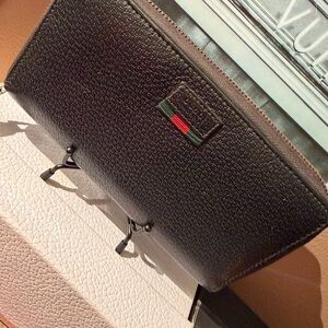This is a Gucci, with the brand's signature green and red Web stripe on small leather tag. The specific style appears is a long zip-around wallet in black pebbled leather.