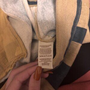 The product is a pair of Free People Majorie High Waist Palazzo Pants in a Striped Wide Leg Tie Boho style. These pants are designed for women in size small, with an adjustable waist size of 42 inches. They are made of cotton fabric in a beige color, featuring a relaxed fit with a belted waist and pockets. The palazzo pants have a 29-inch inseam and are suitable for various occasions such as travel, parties, or casual wear. The tie closure adds a unique touch to the overall bohemian look of the pants. 12.5" Rise. 20" Pant Leg Opening. ***Rip near slit in leg. Elastic interior waist band detached. See photos for all flaws.