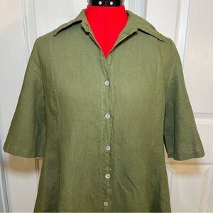 Francesca Bettini Olive Green Short Sleeve Button Up Linen / Cotton Blend Shirt Dress, Has Pockets, Womens M. New With Tags. 2nd Button Down is Missing. There is one small hole on the back.