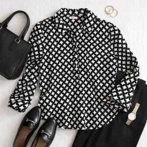 Classic meets modern in this Merona black and white geometric print blouse. Designed with a timeless button-front style, structured collar, and long sleeves, this top is perfect for workwear, business casual, or polished everyday outfits.