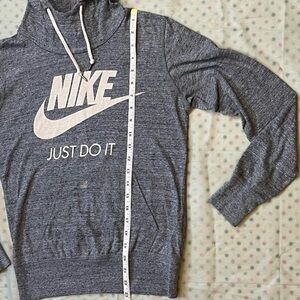 Nike hoodie in heather gray. Features white logo and drawstrings. Soft and casual.