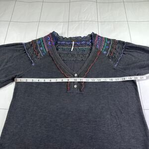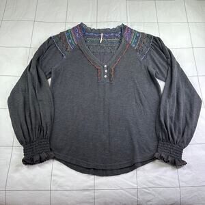 Free People Top Womens Small Gray Siesta Fiesta Embroidered Boho V Neck Henley