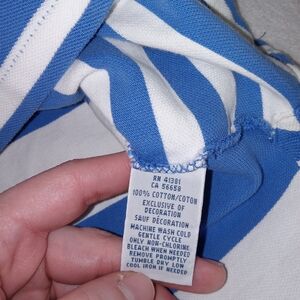 Has a thicker block classic rugby stripe on back and thinner block on front. This item is in excellent condition, no flaws noted, still bright and contrasting. Has a red pony logo giving a very patriotic classic theme. Ships next day any questions will be happy to help!