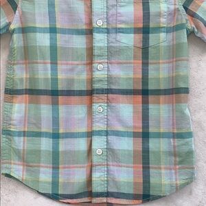 Nice, button down, short sleeve, plaid shirt with mint green, blue, yellow, and light orange colors. In excellent, clean condition! A perfect addition to his spring and summer wardrobe!
