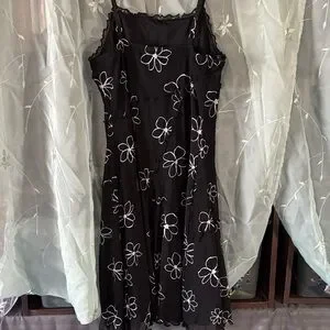 Stylish black mini dress with elegant white floral designs. Ideal for any occasion.