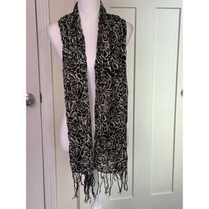 Add a touch of timeless elegance to your wardrobe with this beautiful black and white scarf! Featuring a delicate rose design, this scarf is perfect for adding a sophisticated accent to any outfit.