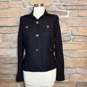 St. John Black Knit Jacket Blazer Size 4 Silver Logo Buttons USA Made