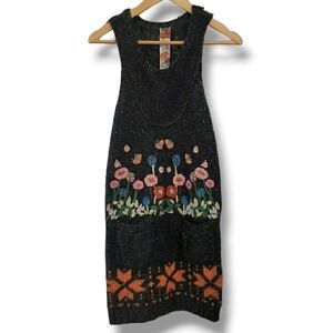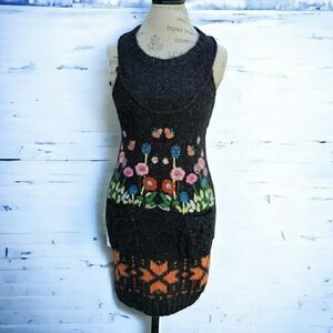Desigual Black Knit Wool Blend qSleeveless Mini Dress. Embroidered Flowers And Butterflies - Rare - Size Medium