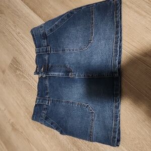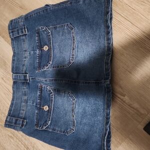 Trendy denim mini skirt. Features front pockets and belt loops. Perfect for casual outings.