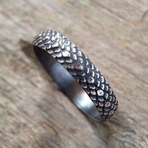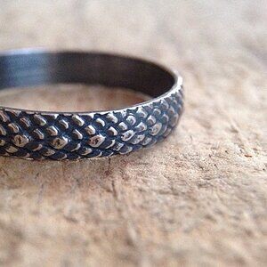 The mermaid scales pattern on this ring is raised so you can feel its awesome texture. Created entirely from solid sterling silver, then given a light oxidized finish. The black patina in the recesses of the metal allows the pattern to stand out. The band measures approximately 4mm wide. This ring is made to order to your size.