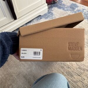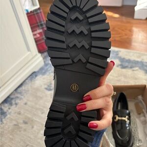 Sleek black patent leather loafers with a chic gold detail. Shoes sadly did not fit me, it is recommended to go a size down on Steve Madden loafers and i unfortunately was unaware. Although this is a 6.5 if you are a size 5.5 these shoes would fit you perfectly! They do have a tiny scuff on the side of the shoe, as shown on the picture.