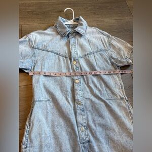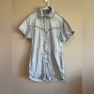Like new free people we the free Stylish light wash blue denim romper perfect for casual outings. Features a button-up front look and short sleeves for a relaxed fit. Collared neckline, relaxed fits Snap closure. 3 inch inseam