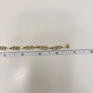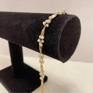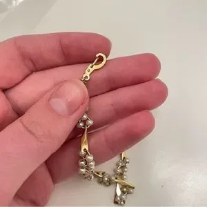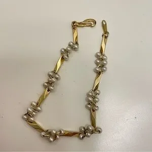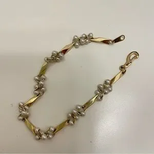 Nothing has stayed in fashion longer than the classic pearls. This bracelet features dainty faux pearl on a vintage metallic gold tone chain. In excellent vintage condition, with no major flaws.