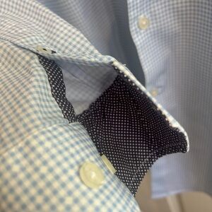 This elegant blue dress shirt features a sophisticated white contrasting collar and cuffs in navy dot, perfect for business settings. Made from a crisp cotton blend, it offers a polished and professional appearance. Beautiful shirt! Looks great alone with the contrast trim or with a tie.