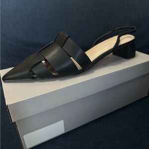 Elegant black heels with a sleek design, featuring a pointed toe and slingback strap. They are ideal for stylish outings, or just for adding elegance to life. These are still in their original box.