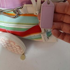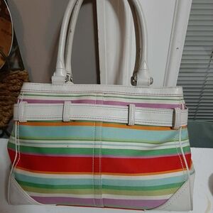 Howdy BagLadies!!! Today's Offering Is That of a "Collector's" Dream! Early Aughts COACH Hampton MultuColored Canvas Tote & Coordinating Colored COACH Op Art Logo Change Purse! 2 Whimsical Vibrant and stylish Pieces To Add To Your Already EPIC Bag Collecsh!😉, this colorful striped women's bag is perfect for adding a pop of color to any outfit. The bag features a mix of pink, red, green, and cream stripes, making it a versatile accessory for any occasion.
