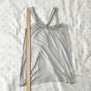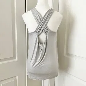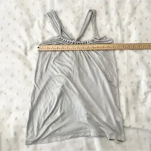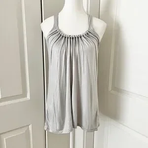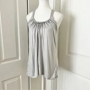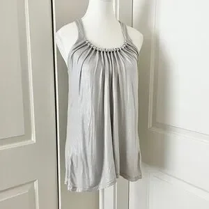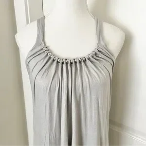 Add a touch of sophistication to your wardrobe with this stunning French Connection halter blouse. Featuring a pleated neckline adorned with silver-tone beaded accents, this piece combines elegance with a relaxed silhouette. Crafted from lightweight, soft metallic fabric in a shimmering gray hue, it offers both style and comfort. The racerback design with wide straps enhances its modern appeal—perfect for evening outings or refined casual looks.