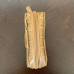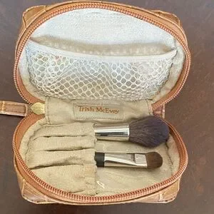 Compact Trish McEvoy brush set. Includes two brushes with sleek silver handles. Stored in a stylish brown case. Great condition.
