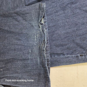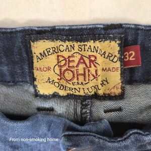 These are a pair of pre-owned women's Dear John blue flare or wide-leg jeans, size 32, as indicated by the visible tag. The jeans feature a button and zipper closure, front slant pockets, and two back patch pockets. There is a visible tear or hole on the lower left leg, and some fading and wear are present, particularly along the seams and hems. The fabric appears to be denim.