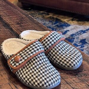 Textile Covered EVA footbed. Soft fur-fur lining. Durable rubber sole.Elegant houndstooth pattern with soft tan trim. Ideal for comfort and style.