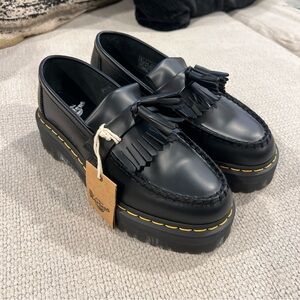 Step out in style with these black tassel loafers by Dr. Martens. Perfect for any occasion, these shoes offer both comfort and a bold look.