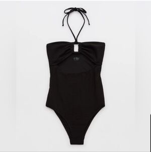 Chic black one piece. Features halter neck tie. Elegant and stylish design.