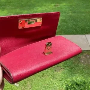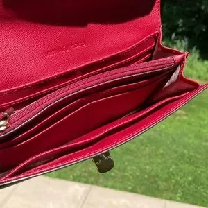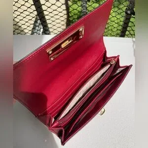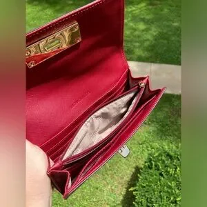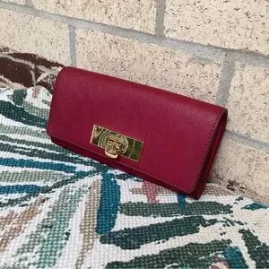Michael Kors Callie Cherry Red Leather Wallet Carryall Large Wallet Gold Turn Lock Hardware Several Compartments