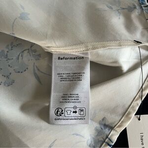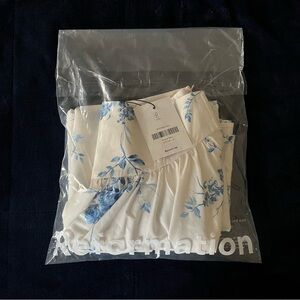 Reformation white and blue floral print high waisted midi skirt. Called the Polina Skirt in the Cecile print. Has pockets. Hook and eye closure at the front of the waistband. Hidden zipper down the side. Has a fitted waistband and the rest is loose fitting. New with tags, stored in original package.