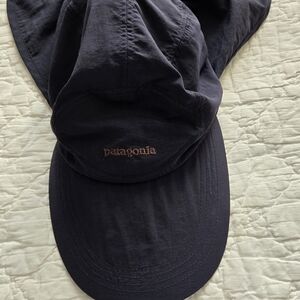 Patagonia sun hat with a neck flap, likely a vintage model or an earlier version of the current "Block-the-Sun Hat" or "Bimini Cap". This style of hat is designed for extensive sun protection, particularly for the neck and ears.