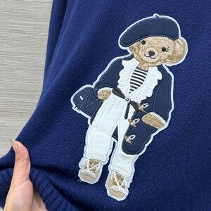 This Ralph Lauren sweater features an iconic embroidered bear in a stylish, sophisticated outfit. The bear sports a chic beret, striped shirt, and tailored coat, embodying a fashionable and timeless look. Perfect for adding a touch of luxury to your casual wardrobe, this piece combines the signature Ralph Lauren aesthetic with playful, yet refined charm.